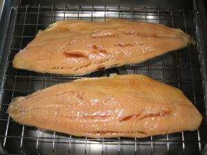 Il faut faire mariner les filets au moins 12 heures dans le réfrigérateur. Je laisse la peau. Je les trempe dans un sac ziplock et j'enlève l'air, pour m'assurer que les filets soient bien trempés, et en plus ça prend moins de place. Ensuite, il faut les rincer à l'eau et les faire sécher, peau vers le bas, sur une grille avec du papier journal pour absorber les gouttes. Ensuite il faut les enduires de sirop d'érable.