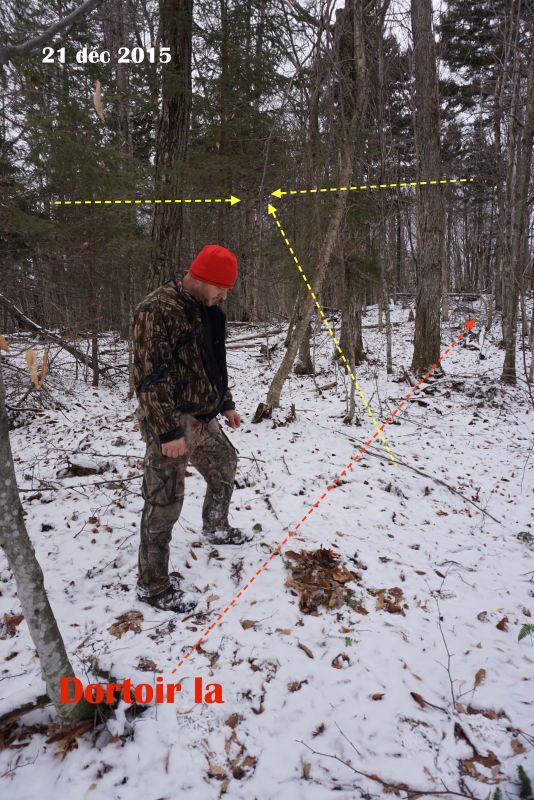 La plus part du temps les mâles ne sont pas pressés d'entrer dans leurs dortoirs le matin. Ils prendront souvent au moins 1 heure de clarté avant d'y arriver pour y passer la journée. N'étant pas pressés, ils ont tout le loisir de bien analyser le terrain. Pour la chasse du matin, il est important d'y arriver bien avant eux afin de laisser le temps à l'environnement de retrouver sa quiétude. Mais surtout, il ne faut pas croiser leurs sentiers d'accès. Durant justement cette heure où les mâles ne sont pas pressés d'y arriver, ils brulent du temps à faire des frottages au tour de ce secteur de repos. Il est donc facile de trouver par où ils arrivent en cherchant les sentiers qui sont marqués par les frottages. Ces mêmes frottages vous indiquent s'ils y arrivent de matin ou de soir en interprétant le tout en fonction des sites nourriciers. Dans le cas d'un sentier qui sert d'accès le matin, j'y arriverai par la direction contraire bien avant le lever du jour. Ne sous-estimez pas le nez des chevreuils du Québec. Le simple fait de laisser une odeur de pas suffit à faire dévier de son chemin la plupart des mâles de 2 ans et demi ou plus. Je suis d'avis aussi que pour chasser efficacement les secteurs de repos, il faut être prêt à y demeurer à l'affut tout au long de la journée. Dans un secteur de repos, il n y a pas d'heure où les probabilités sont à zéro, un buck peut déboucher devant vous à toute heure du jour.
