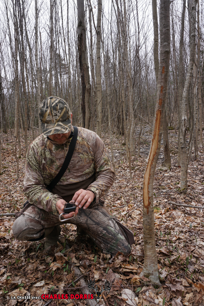 Alors la voici la prospection active. Trop de chasseurs ont peur de prospecter une fois la saison débutée. Le risque de contamination du secteur par les odeurs, la peur de pousser les chevreuils chez les voisins ne sont que deux exemples revenant souvent comme prétextes pour ne pas marcher le territoire durant la chasse. Certes il peut y avoir certains risques associés aux deux éléments mentionnés précédemment. Mais quel succès obtiendrez-vous si vous n'êtes pas au bon endroit au moment de chasser ? J'insiste beaucoup sur ce fait lors mes journées de formation ou d'analyse sur le terrain de chasse de mes clients. J'ai constaté au cours des dernières années, que cette lacune était très répandue et contagieuse. Alors je vous propose maintenant une série d'approches proactives qui m'ont donné du succès. Je vous explique la microtechnique qui m'a procuré le plus de succès en période de rut. Mais d'entrée de jeu, je vous explique ma façon d'effectuer la prospection active. Dit simplement, la prospection active est une prospection immédiate. Règle générale, les chasseurs effectuent leurs prospections bien avant leurs chasses. Bien que cette prospection soit un incontournable, elle ne nous donne pas les informations nécessaires lorsque arrive le moment de chasser. J'effectue une prospection, soit la veille de ma chasse ou lors de mes journées de chasse. Une fois un endroit chaud découvert, je le chasse immédiatement et ce jusqu'à ce que je comprenne que le secteur n'est plus chaud. Que ce soit dans la période de rut ou dans une période de nutrition active des mâles je fais toujours ce type de prospection. Plusieurs chasseurs ont peur de déranger les cerfs en marchant leurs secteurs de chasse. Ce qu'il faut comprendre, c'est que les cerfs n'ont pas le choix de vivre dans le bois. Ainsi, pour éviter de les stresser trop fortement, à chaque fois que je vais marcher mon secteur, je m'annonce constamment. C'est à dire que je marche d'un pas rapide et je fais du bruit. Avec cette façon de marcher les cerfs m'entendent arriver de loin et ne font que se tasser de quelques dizaines de mètres pour, à l'occasion, me regarder passer. Souvent leur curiosité les ramènera à venir sentir ce que j'ai fait. Un cerf sait comment faire la différence en l'attitude d'un promeneur et celle d'un chasseur. Le chasseur essaie de ne pas faire de bruit et passe de long moment à analyser chacun des détails de la forêt. Mais le promeneur ne s'attarde pas. Je ne suis pas le premier à écrire cela, mais j'insiste toujours sur la force de cet énoncé. N'avez-vous jamais aperçu un cerf incrédule à moins de 30 mètres de vous lors d'une balade bruyante en forêt ? Alors, marchez votre secteur et chassez les endroits chauds immédiatement après votre découverte. Sinon, vous risquez fort de chasser des points morts pendant que ça brasse quelque part sur votre terrain de chasse.