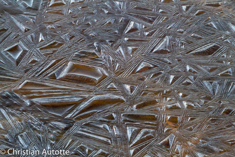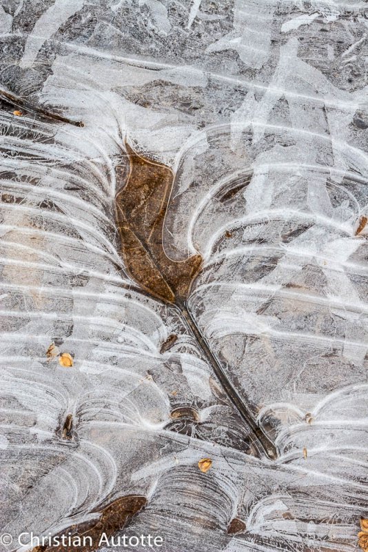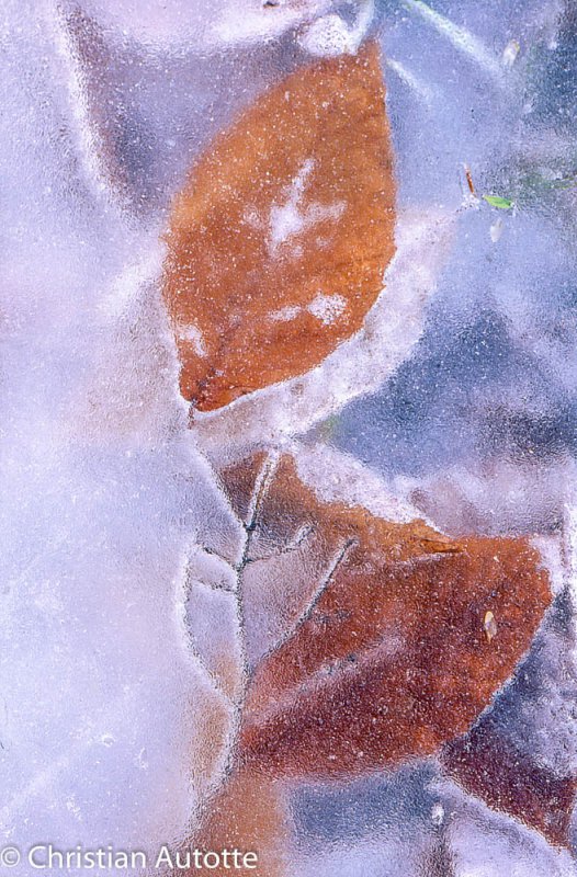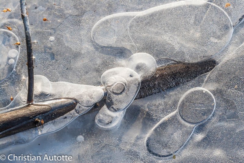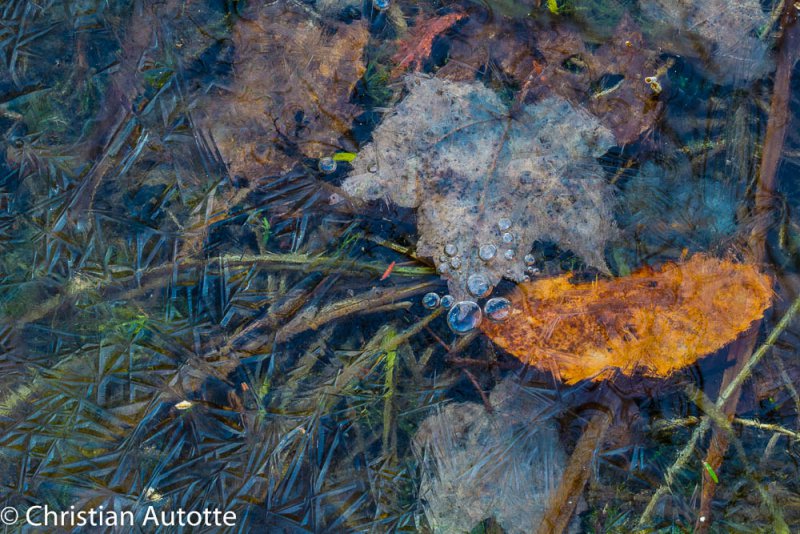 La glace du début d'hiver, celle qui peut contenir les dernières feuilles mortes de l'automne, se photographie généralement de la berge. Il est rare que cette nouvelle glace soit assez épaisse pour que l'on puisse marcher dessus en toute sécurité. Cherchez donc le long des mares, mares à castor, ou lac tranquilles. Les simples trous d'eau ne sont pas à négliger; j'ai souvent fait d'excellentes photos dans les ornières remplies d'eau gelée d'un chemin forestier. Plus tard, la glace des mares et des lacs donne parfois des images intéressantes lorsque libre de neige; on y trouve souvent des bulles d'air qui peuvent créer des motifs intéressants.