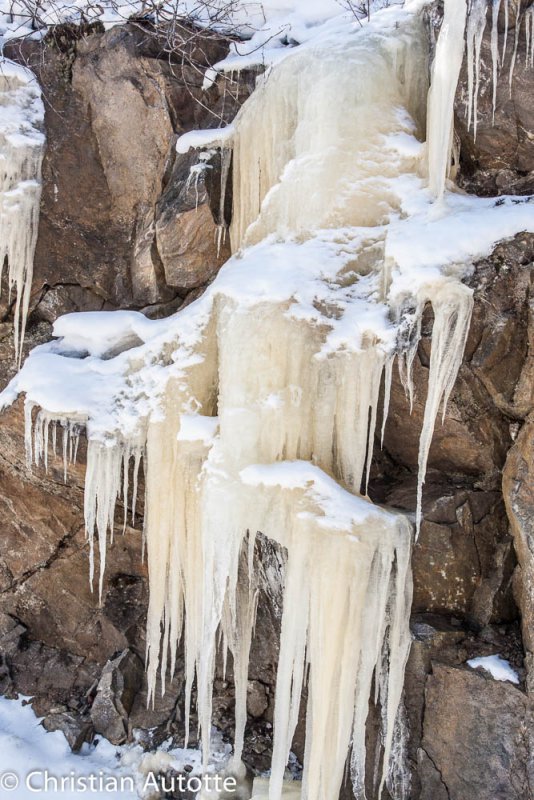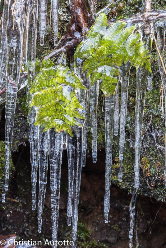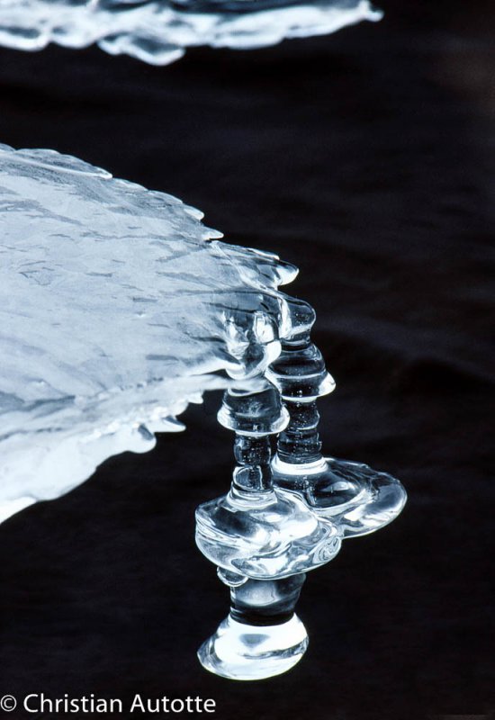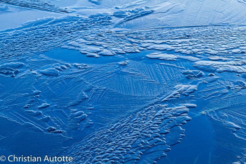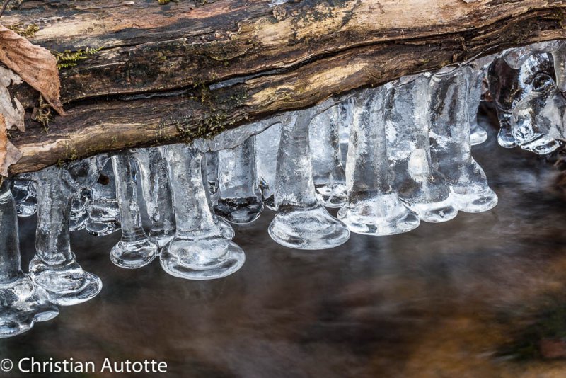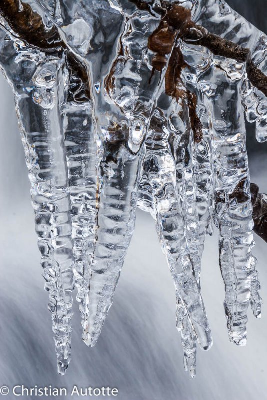 Avec l'arrivée du temps froid arrive également le gel total ou partiel des plans d'eau. Lacs et mares auront tendance à geler de façon uniforme, formant une glace souvent lisse et propre au patinage, avec ou sans patins… Une telle glace, surtout au début de l'hiver, peut contenir des feuilles, branches ou autres débris qui ajouteront de l'intérêt. Par contre, si la glace prend durant une journée venteuse, elle peut prendre des formes fantaisistes qui peuvent être du plus bel effet. Quant à eux, les ruisseaux et rivières, surtout dans les endroits où l'eau est agitée, garderont des zones libre de glace aux bords desquelles on retrouve souvent des glaçons de formes tourmentées qui seront des sujets de prédilection pour tout photographe averti. Il faut toutefois approcher de tels sujets avec circonspection. Méfiez-vous des pentes le long des ruisseaux ou encore de la glace mince le long des lacs. Se retrouver mouillé à -20°C et à 5 ou 6 km du point chaud le plus près n'a rien d'agréable et pourrait même s'avérer mortel. Sécurité d'abord!