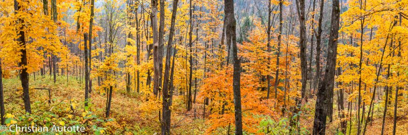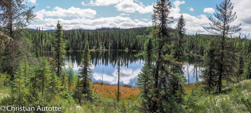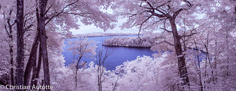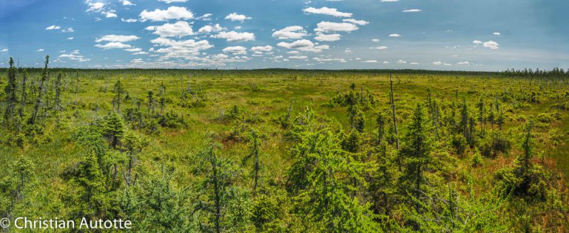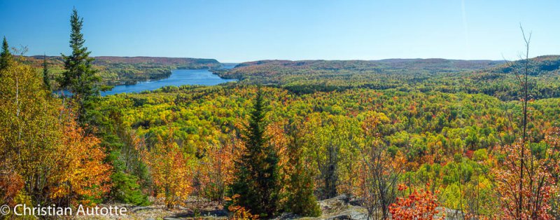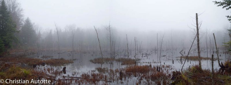 Plusieurs de mes panoramiques sont réalisés à main levée. J'utilise une grille dans mon viseur pour maintenir l'horizon le plus droit possible et pour aider à garder suffisamment de chevauchement dans les images successives. Lorsque c'est possible, surtout quand la lumière est plus faible, je sors le trépied. La tête que j'utilise me sert également en macrophotographie; il s'agit d'une tête dite « trois voies », ce qui signifie que le positionnement horizontal-vertical-latéral se contrôlent indépendamment l'un de l'autre. Une fois le trépied bien au niveau, je peux alors positionner la caméra en m'assurant qu'elle aussi est bien au niveau, pour ensuite faire ma série de photos en tournant l'appareil de gauche à droite entre chaque image.