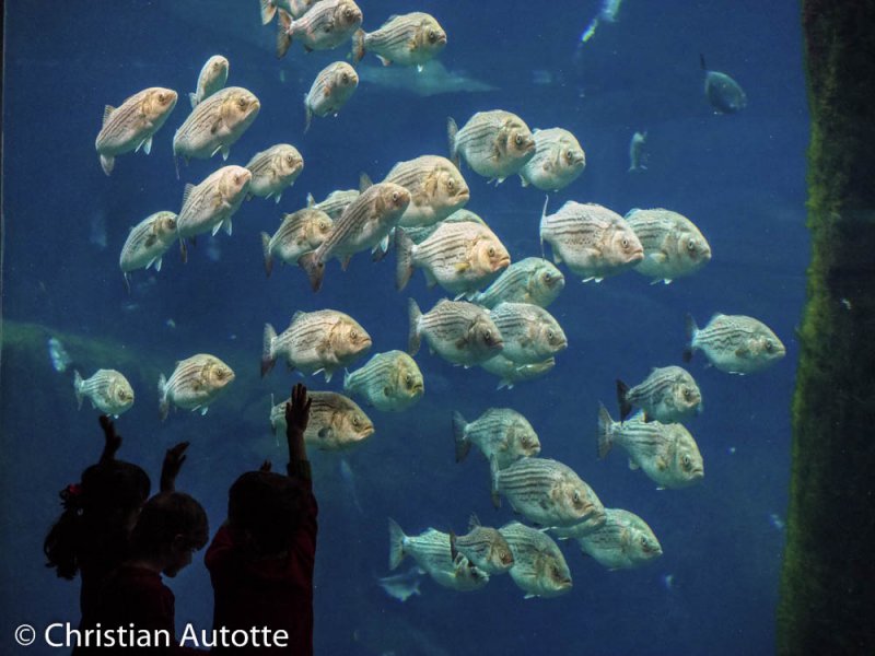 Dans ces aquariums publics il est généralement interdit d'utiliser un flash pour éviter de stresser les pensionnaires de l'institution. De toute façon, dans des aquariums aussi volumineux la lumière d'un flash se perd très rapidement; dès lors, soit le sujet est mal éclairé, ou encore il reçoit suffisamment de lumière mais le fond est parfaitement noir, donnant l'impression d'une photo faite de nuit. On travaille donc avec l'éclairage fourni par l'aquarium, qui souvent sera assez faible. Il faudra alors se résoudre à monter l'ISO et peut-être à maintenir l'ouverture la plus grande (f/2.8 ou f/3.5) pour capter le plus de lumière possible. Tenez-vous le plus près possible de la vitre de l'aquarium pour éviter de voir des reflets, non seulement le vôtre mais aussi une réflexion de tout ce qui peut se trouver derrière vous.