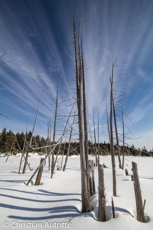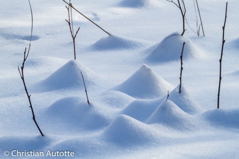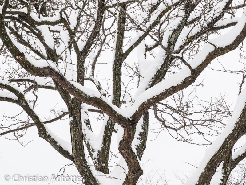 La photographie en hiver comporte son lot d'inconvénients et de difficultés. On pourrait facilement imaginer le froid comme étant le problème majeur, mais avec un peu d'effort et de préparation la froidure hivernale est facilement remise à sa place. Le photographe doit d'abord s'occuper de son propre confort en s'habillant en fonction de la température et de son niveau d'activité. Une randonnée en raquettes ou en ski de fond demande à être habillée moins chaudement que l'attente d'un gibier quelconque dans une cache. Favorisez l'habillement en couches que l'on peut ajouter ou retirer suivant le besoin; un petit sac à dos sera alors essentiel pour contenir les pièces de linge supplémentaires. On pourra également y mettre une collation et, pourquoi pas, un thermos de chocolat chaud…