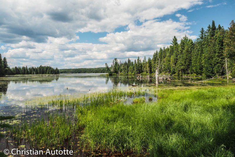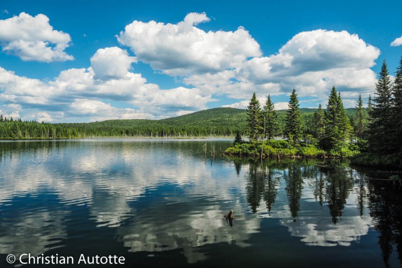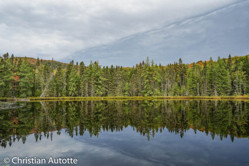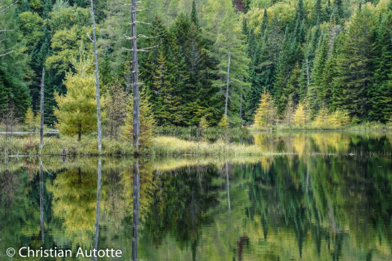 Si on se fie toujours à la règle des tiers, une ligne d'horizon ne devrait jamais être placée exactement au centre de l'image. Ici encore, il est possible de faire fi de la règle en certaines circonstances. En ce qui me concerne, il s'agit la plupart du temps d'images d'eau où le paysage et sa réflexion s'ont d'un intérêt égal. On parle souvent d'un « effet miroir »; placer l'horizon parfaitement au centre de l'image accentuera l'effet recherché.