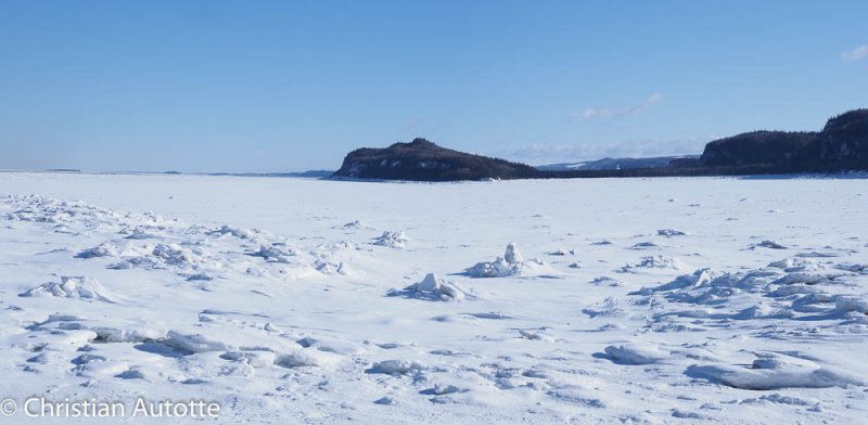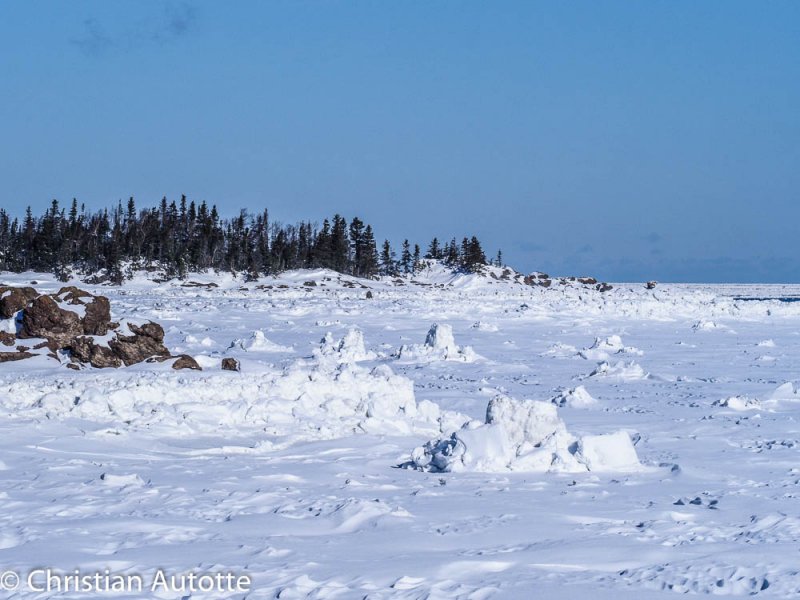 La démarcation entre la mer et la terre n'est pas aussi évidente en hiver. Les côtes rocheuses qui font mon bonheur en été disparaissent sous la neige. Les baies peu profondes sont gelées et enneigées, mais malgré les apparences, elles font toujours partie de la mer; la y marée monte et descend toujours. L'été, la marée découvre roches et bancs de sable; l'hiver, cette même marée crée des formes fantasmagoriques, des monticules de glace éparpillés à travers les baies. Il peut y avoir un rocher sous certains de ces monticules, mais plusieurs se forment simplement lorsque l'eau remonte à travers une fissure dans la glace croitre au gré des marées.