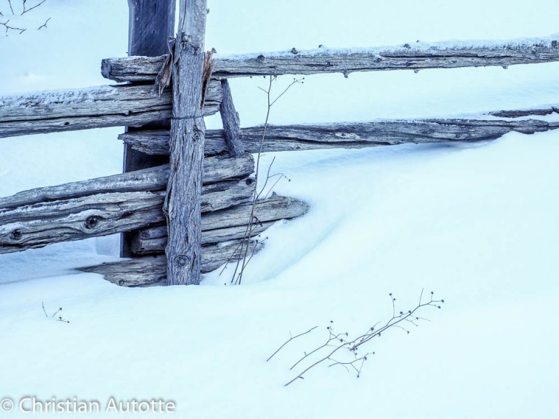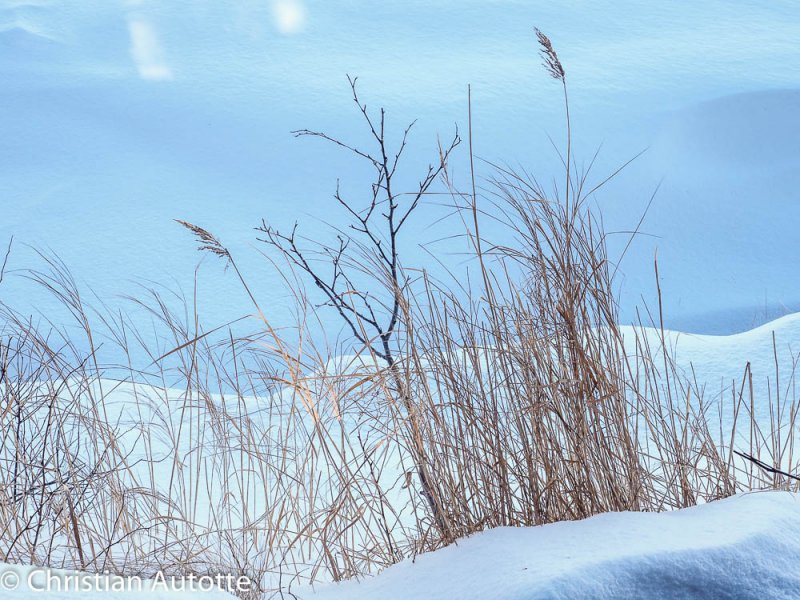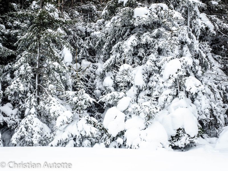 La météo m'a été favorable, avec un mercure oscillant à peine sous le point de congélation. A mon arrivée, le ciel était couvert pour se dégager le lendemain. En hiver, les photos de paysage manquent parfois de contraste; il est souvent préférable de se concentrer sur des sujets plus intimes, des détails de végétation, ou des paysages forestiers qui bénéficient de la lumière plus douce et plus uniforme. Néanmoins, la photo numérique permet de jouer un peu plus avec l'image en post-production pour améliorer son contraste et donner un peu plus de relief à un ciel blanc et sans intérêt.