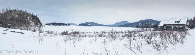 Comme à bien des endroits du Bas du Fleuve et de la Gaspésie, les paysages du Bic sont parfois si vastes qu'il est pratiquement impossible de leur rendre justice dans une seule image, j'ai donc fait plusieurs panoramiques. Sans trépied, j'ai simplement fait des images horizontales que j'ai ensuite assemblées avec Lightroom. Ce n'est pas la façon idéale, surtout si l'intention est de faire de grands tirages, mais c'est très souvent suffisant pour obtenir des images adéquates. Je reviendrai sur la bonne façon de faire du panoramique dans un futur blogue.