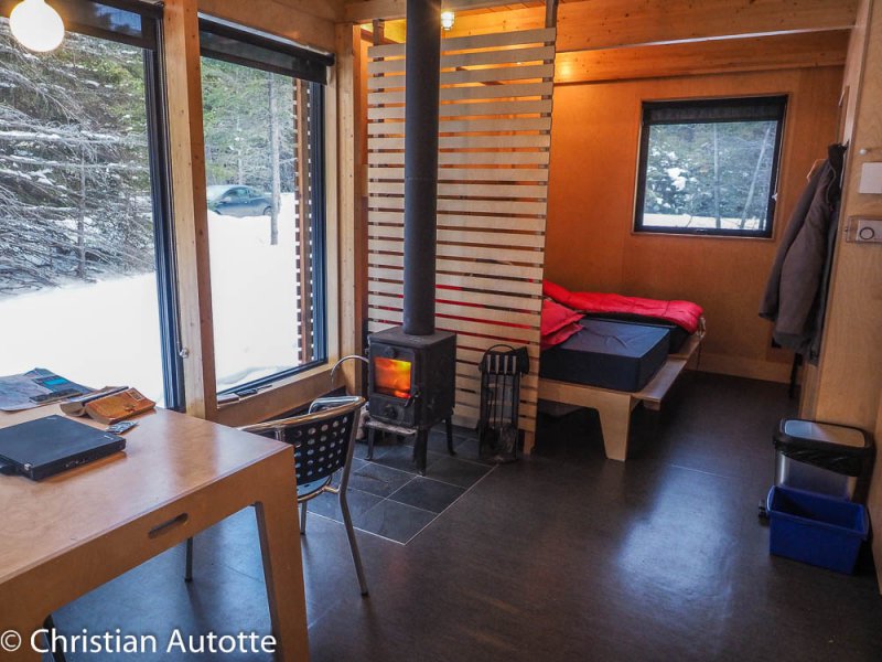 J'ai loué un chalet désigné comme EXP : petits mais confortables, ils sont tous fournis, de la vaisselle aux serviettes, du micro-onde au petit poêle à bois, sans oublier la cafetière et le petit frigo. Taille modeste mais suffisant pour un couple, un peu petit pour une famille. Officiellement, ils sont accessibles à partir de 17 :00, mais on peut souvent y accéder entre 15 :00 et 16 :00. Qu'à cela ne tienne, je n'allais pas au Bic pour passer mon temps à l'intérieur! Je suis arrivé vers l'heure du midi. Après m'être enregistré et récupéré la clef du chalet j'ai chaussé mes raquettes pour une première randonnée.