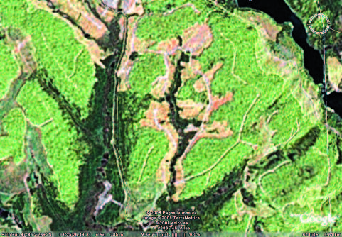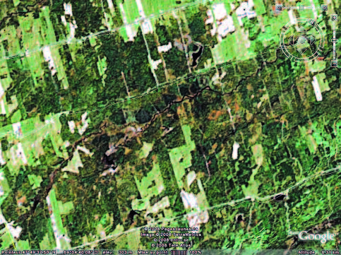 Si, par endroits, l'image peut être claire au point de voir un camp de chasse sur le bord d'un lac (c), la résolution peut êtremoins bonne dans d'autres secteurs, mais en général ce logiciel donne une très bonne idée du territoire. «Zoomez» sur le secteur pour vous donner une première vue d'ensemble. Vous apercevrez les feuillus en vert pâle, les résineux en vert plus foncé, de même que les coupes, lacs et chemins (b). Si jamais vous avez fait l'erreur de choisir un territoire privé, vous le saurez en voyant les travaux forestiers qui y ont été effectués. Grâce à leurs dimensions (1,6 km [1 mi] de long par 250 à 275 m [environ 800 ou 900 pi] de large), vous pourrez aisément voir les séparations entre chaque lot marqué par des travaux forestiers (a). Avec Google Earth, on distingue assez bien l'habitat de l'orignal. On peut également mesurer des distances en tenant compte du relief, et cela va vous donner une bonne idée de la superficie de votre territoire. Assurezvous d'en choisir un assez grand, car certains secteurs peuvent être déjà occupés par des chasseurs. Idéalement, il faut se servir de Google Earth pour procéder à l'analyse rudimentaire d'un territoire d'au moins 30 km2. Par la suite, vous pouvez commander la carte écoforestière du secteur en vous référant au nom d'un lac ou à la position (coordonnées en degrés, minutes, secondes indiquées par Google Earth). Ce type de carte permet de visualiser tout l'habitat de l'orignal; les différents peuplements sont différenciés par type d'essence, par leur densité et leur hauteur, de même que leur âge, etc. Si vous savez reconnaîtreles bons endroits grâce à ces cartes, vous disposez d'un atout supplémentaire. Voici le numéro de téléphone pour commander une carte écoforestière : 1 877 936-7387.