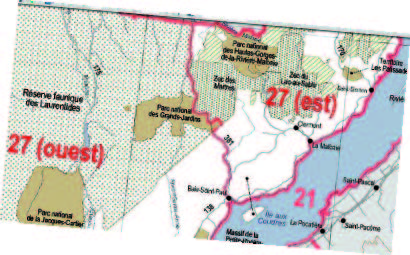 Vous y verrez une carte du Québec montranttoutes les zones de chasse, et vous pourrez cliquer sur celle de votre choix (la 27 dansl'exemple ci-contre). Les secteurs couverts de pointillés serrés sont les zecs, donc des territoires publics. Ceux où les pointillés sont plus espacés sont les réserves fauniques, ceux remplis de traits bliques sont des pourvoiries à droits exclusifs et ceux de couleur beige, les parcs nationaux ou provinciaux. Tous les noms des zecs, réserves fauniques et parcs nationaux sont indiqués. Pour le reste, tout ce qui est en blanc représente des territoires libres ou privés. Votre choix devra se faire dans une zec ou un territoire libre. Si vous choisissez une zone en blanc, assurez-vous de ne pas vous trouver en terrain privé. Pour ce faire, éloignezvous des villages et des rangs.