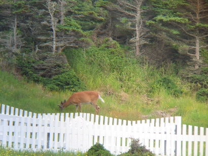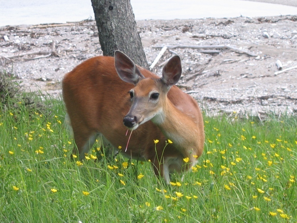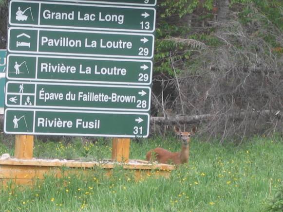 À Rivière à l'huile, un chevreuil nous attend. Nous sommes si proche qu'on l'entend croquer à belles dents son souper du jeudi soir.