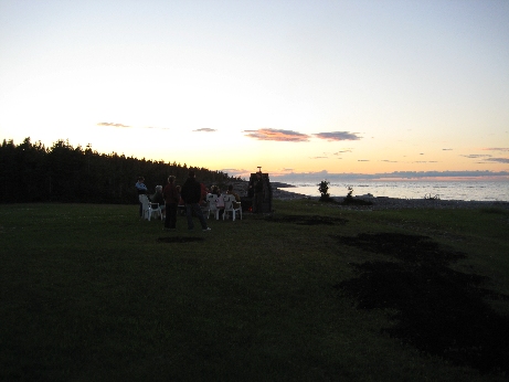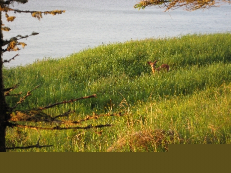 Arrivé au chalet, nous avons une belle surprise. La vue sur la mer est très jolie. Nous avions cru entendre, que du chalet, que nous n'avions pas la vue sur la mer ce qui occasionna cette belle surprise. L'embouchure de la rivière est à moins de 100 mètres du chalet et c'est là que j'irai taquiner la truite. À l'embouchure, nous avons vus à quelques reprises des chevreuils.