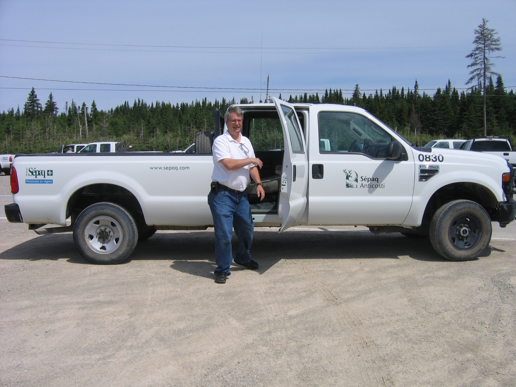 Le départ s'est fait par avion de Mont-Joli à 9h15. Le DASH 8 de Air Inuit a pris 55 minutes pour nous amener à bon port. Le pilote a fait un virage serré pour saluer notre entrée sur l'île. À l'arrivée, on s'enligne au comptoir de la SEPAQ Anticosti pour l'enregistrement et obtenir quelques informations de base.Après, on s'enligne à nouveau afin qu'un pick-up Ford 250 nous soit octroyé pour la durée de notre séjour.