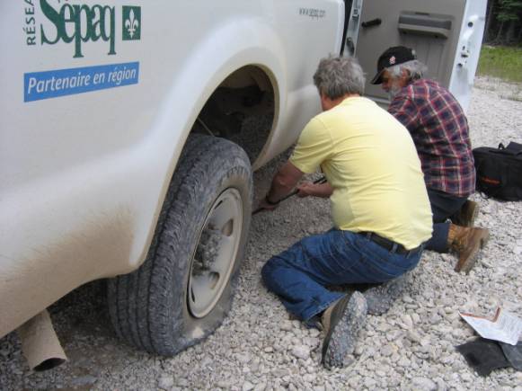 Nous avons décidé d'aller visiter l'embouchure de la rivière Galiote qui est à moins d'un kilomètre des chalets. Première crevaison sur l'île. Un charmant vacancier est venu me donner un coup de main pour changer le pneu. Sur l'île les crevaisons sont fréquentes. Le personnel de la SEPAQ recommande de ne pas circuler sur les abords des routes.