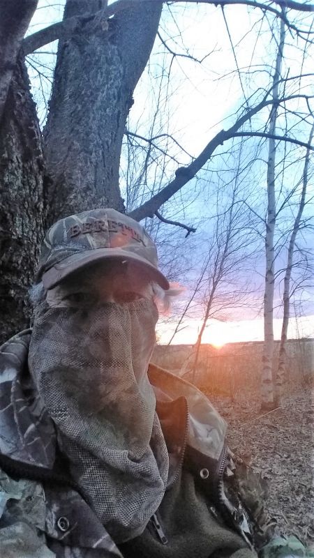 Nous y voilà maintenant à ces journées tant attendues. Accotés sur un arbre, camouflés le mieux possible, on espère être au bon endroit. Pas loin du dortoir, je vois des dindons au faîte d'un gros tremble. On attend. Lors des premières minutes de chasse, nos préoccupations sont principalement tournées au setup. Ajustement du coussin, des vêtements et de notre site afin d'être le plus camouflé possible et ce sans faire de bruit. Sorties des calls, des jumelles, etc. Je suis prêt physiquement et psychologiquement pour cette chasse. Le paysage est changeant au fur et à mesure que les minutes passent. C'est la période où les oiseaux sont les plus actifs, tout au moins au niveau du chant. Chacun fait son coq. À gauche, le soleil se lève et les teintes du ciel se dessinent comme une aquarelle.