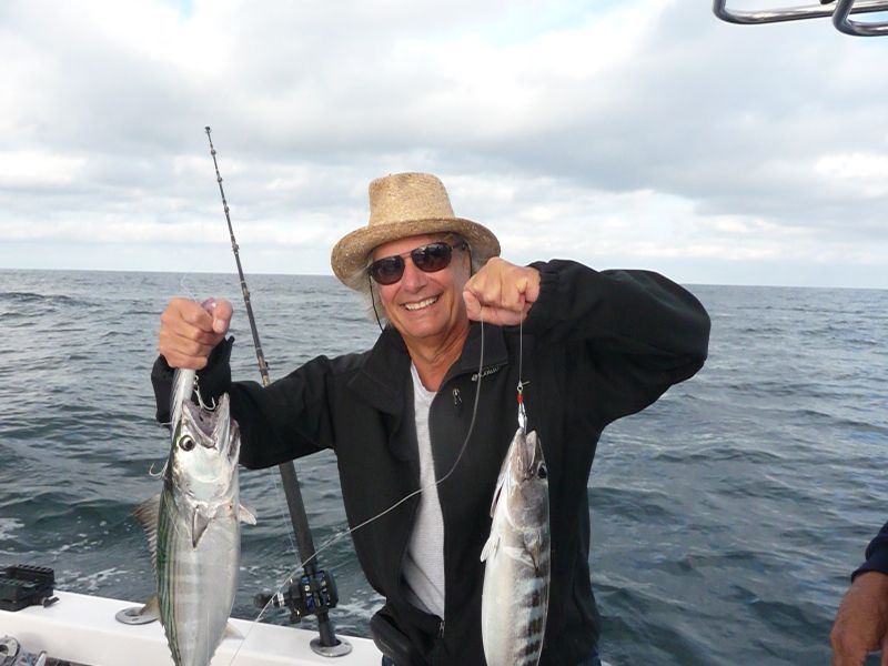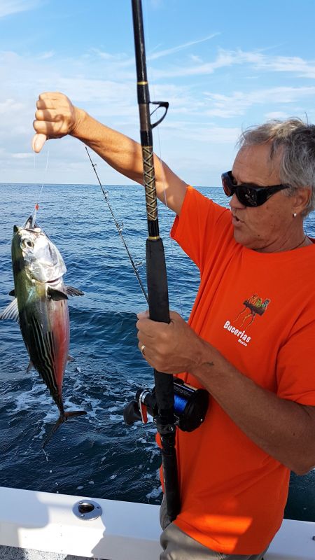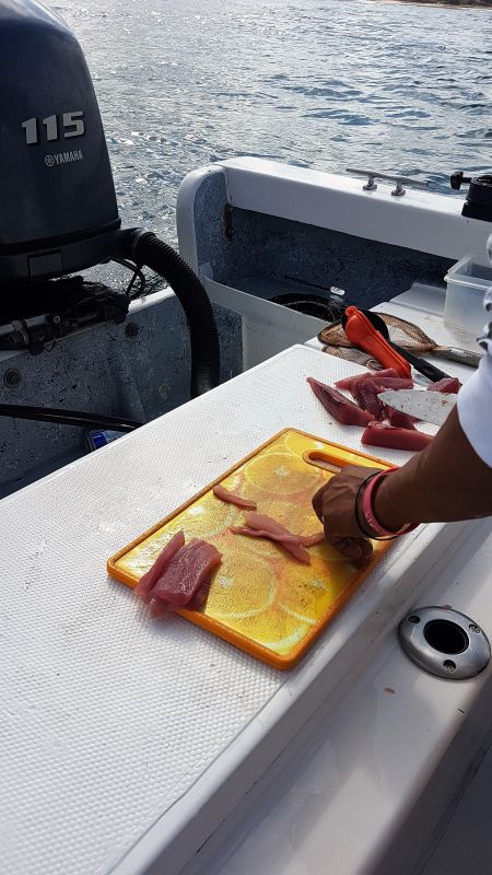 Denis ramène un premier Bonita. C'est un poisson qui se déplace plus près de la surface pour se nourrir et ils sont plus nombreux en cette période-ci de l'année que d'autres espèces. Nous allons au cours de notre expédition en capturer environ une dizaine.