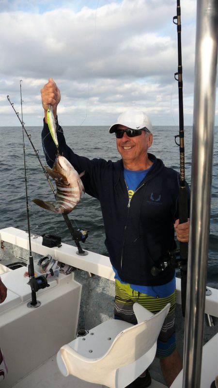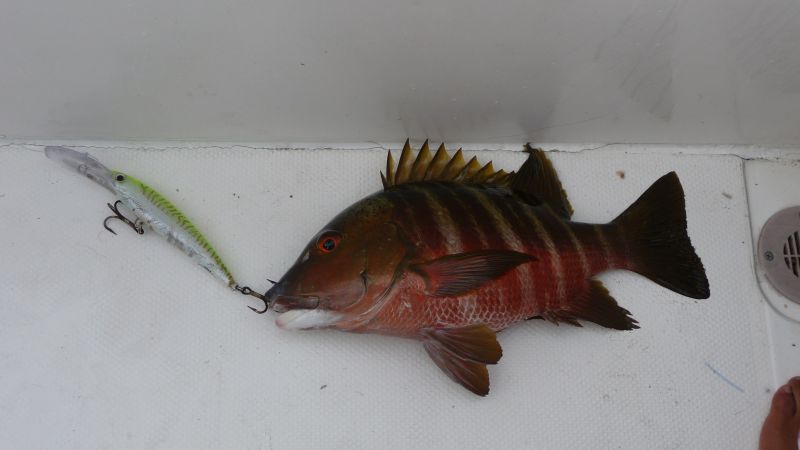C'est parti, après une heure de navigation environ, les lignes sont préparées et les Rapalas sont prêts à provoquer le poisson convoité. Jacques nous sort comme première prise un Red Snapper. Première fois que je vois ce type de poisson hors de mon assiette. Beau poisson qui mène une belle bagarre à l'approche du bateau.