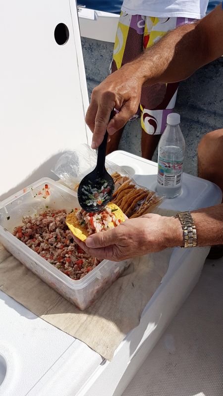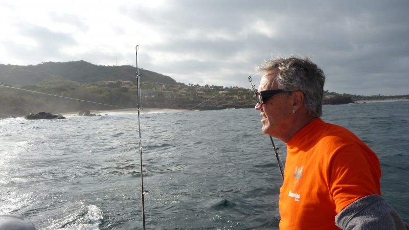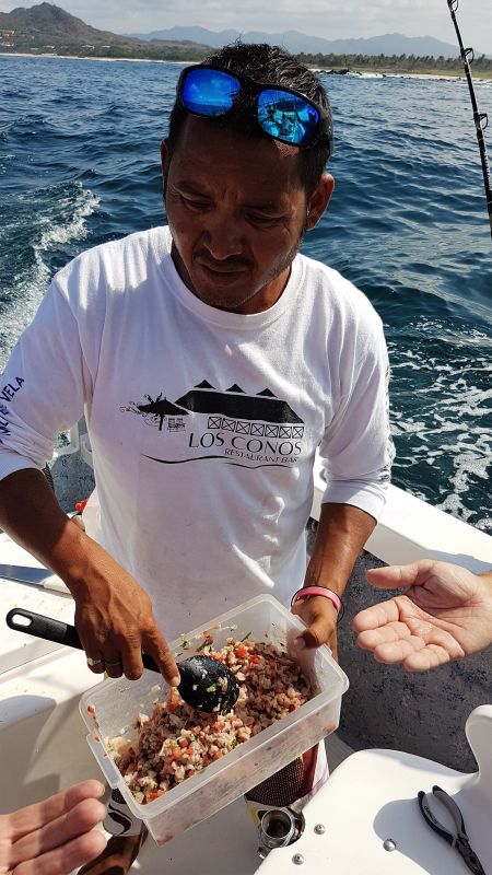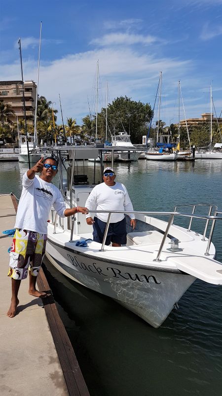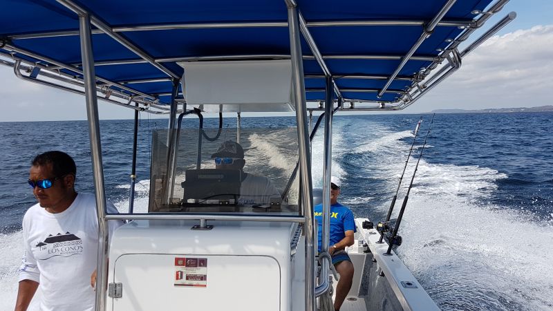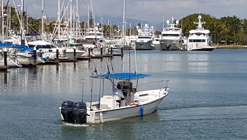 Le bateau est parfait pour une telle expédition. Munis de deux moteurs Yamaha de 115 forces, notre bateau de pêche était prêt à chevaucher les vagues de la Baie de Banderas à la recherche de poissons que nous ne connaissons pas. Pour nous trois, c'est une première expérience de ce type de pêche. La pêche d'un espadon de 300 lbs ou d'un merlin nous enchanterait mais ce n'est pas la saison selon Josée, notre capitaine. Nous avons plus de chances de prendre du Bonita que tout autre poisson. Quoi de mieux qu'une pêche en mer avec des chances de voir des baleines avec une température 25 degrés Celsius.