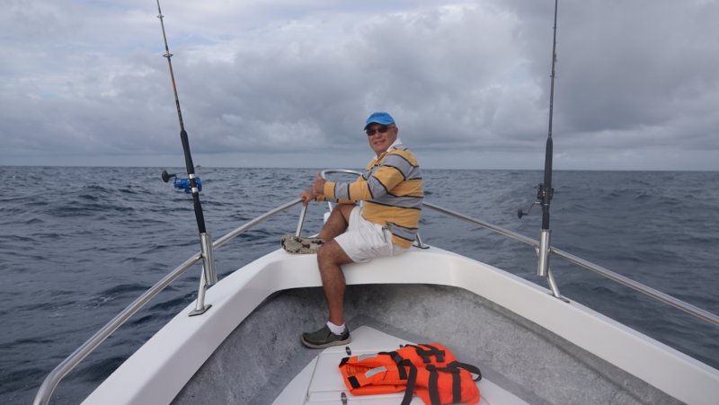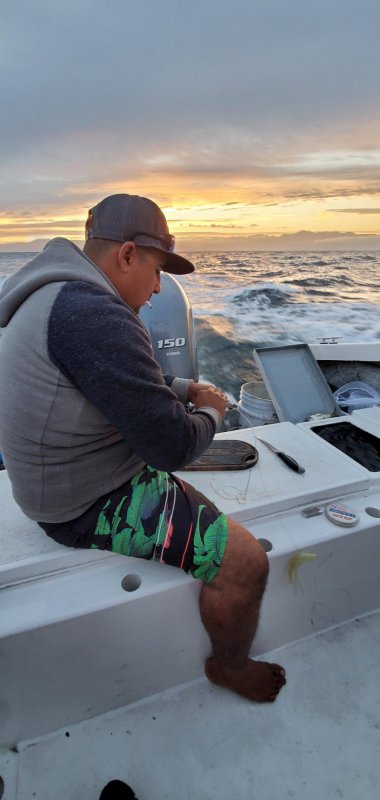Revenons à la pêche. Nous avons pêché à l'aide d'appâts vivants et de Rapala. Toutes nos prises ont été faites sur les appâts vivants.  Nos principales prises furent des Bonitas, Maquereaux et des Toros. Nous nous relayons l'un après l'autre sur les cannes avec appâts pour donner la chance à tous de ramener une prise de choix. Maquereaux et Bonitas sont ramenés à la maison pour consommation et Toros, rejetés à la mer puisqu'ils ne sont pas nécessairement très comestibles.