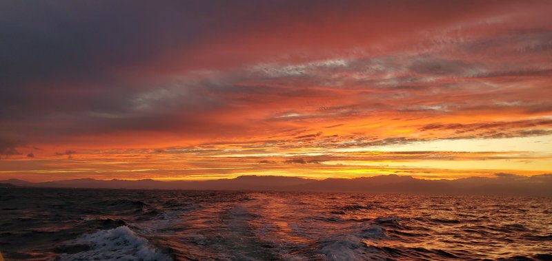 Le spectacle du lever du soleil valait à lui seul cette expédition. Quelle beauté ! Un feu incandescent dans le ciel nous a accompagné pendant près d'une heure. Quelle beauté ! Les baleines étaient également au rendez-vous à de nombreuses occasions. Difficile cependant de les prendre en photos lorsqu'elle nous montre leur queue. J'aurais dû mettre mon appareil en mode rafale… mais trop tard, ce sera pour la prochaine fois ! Les photos des baleines ne sont pas toujours au focus mais ça vous donne une idée de ce que nous avons vécu.