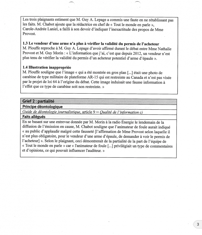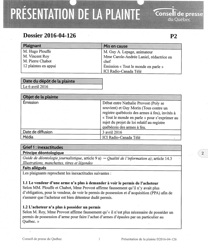 J'ai à l'époque, porté plainte à Radio-Canada et au Conseil de presse sur le manque d'objectivité de Radio-Canada dans le traitement de l'information lors de cette émission à TLP. Nous savons maintenant que la plainte sera étudié au Conseil de presse. Voici les informations obtenues à ce jour.Voici la plainte qui sera entendue au Conseil de presse, près de 2 ans après les faits !