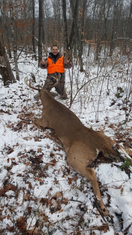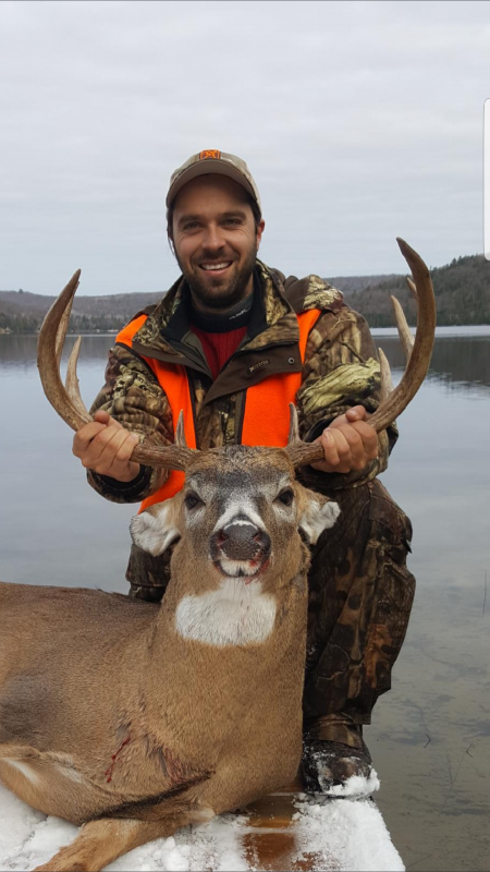 Le samedi 10 novembre 2017, au matin, des odeurs de mâle pré rut ainsi que de phéromone on été installer prês de mon mirador aux intersection des ''runways'' de chevreuil. Par la suite, j'ai laissé reposer le site, jusqu'au matin du 14 novembre, (pendant ce temps je chassais dans un secteur avoisinant). Donc le matin du 14 novembre, je me suis présenté assez tôt comme à l'habitude, au alentour de 06:45h, pas trop à la noirceur, car j'aime bien voir ce que je fais bouger en entrant dans le bois le matin! Arriver aux intersections de ''runways'' près de mon mirador, j'ai fais des corridor d'urine de femelles en chaleurs, sur environ 200 pieds, dans chaque sentier qui menait à l'intersection principale des ''runways'' existant de chevreuil avec le produit ''The Buck Bomb''. De plus, j'ai aussi fais une ''bombe d'odeur'' au pied de mon échelle, tout juste avant d'y monter, toujours avec le même produit, (car ce produit permet de faire les deux, soit de répandre de l'odeur, soit faire une bombe d'odeur). L'odeur de femelle en chaleur était donc présente un peu partout aux intersections des ''runways'' de plus une forte odeur au pied de mon mirador (dû à la bombe d'odeur), du fait même, ceci permettait de camoufler mon odeur. À peine une heure de passé, bien perché dans mon mirador à l'affût, j'entends un chevreuil à ma droite qui descent complètement du haut de la montagne à une vitesse jusqu'à présent jamais observé par un chevreuil. Il est arriver à la vitesse de l'éclair, comme une flèche! Ce qui aurait pris environ deux minutes, à un humain, au pas de marche normal, a pris au maximum dix secondes au chevreuil! Il descendait la montagne comme un train pour arrêter sa course à 55 pieds de moi à ma droite, tout juste à l'intersection principale de ''runway'', imaginez! L'orsqu'il c'est immobilisé, il regardait de gauche à droite sans arrêt tout en lâchant quelques gémissements, les yeux complètement blanc, comme s'ils étaient virés à l'envert. Définitivement, ce mâle cherchait la femelle en chaleur, ou du moins, d'où provenait cette odeur. Le temps d'enlever mes gants, d'attraper ma carabine, de me mettre en position de tir, d'ajuster mon téléscope, (car le gibier était beaucoup trop prêt par rapport à l'ajustement précédente), tout ce temps celui ci n'arrêtait pas de regarder de gauche à droite toujours à la recherche de cette odeur. Cest donc à ce moment, soit à 08:04h le matin du 14 novembre 2017, dans la région de Mont Laurier (Chûtes St-Philippe plus précisément), à l'aide d'une carabine Browning BLR 308, que j'ai abatu ce magnifique mâle de 250lb, 9 pointes, 23po de panache. Je venais donc de déjouer un chevreuil mature, grâce à plusieurs facteurs. Premièrement, j'ai abandonner mon premier site d'appât, pour me déplacer à environ 400 mètres plus haut dans la montagne, les odeurs de mâle pré rut, combiner à celle de femelles en chaleurs avec le produit ''The Buck Bomb'', le fait d'être en pleine semaine, un mardi, avec aucune pression de chasse, (c'était tellement tranquille dans le bois), aucun bruit, même au loin, pas de vtt aux alentour, aucune odeur humaine, (mis à part la mienne que je fais tout en mon possible pour camoufler de différentes façons), la date (le 14 novembre), à pareille date l'an passé la chasse était fermée, on ne pouvait donc pas profiter pleinnement de la période du rut, mais cette année oui, etc... Le sol était couvert d'environ 2 centimètres de neige, une température de -2 degré celcius, ciel nuageux, aucun vent! Jaimerais mentionner que j'avais aucun signe de sa présence. Pour avoir marché plusieurs kilomètres dans la montagne à la recherche d'indice, je n'ai trouver, aucun frottage, aucun grattage, mes faux grattages n'étaient pas visité, mes caméras de surveillance ne captaient que des femelles à l'occasion, pourtant, ce qui ma frappé le plus quand j'ai pris son panache dans mes mains, c'est l'écorce qui pendait entre ses bois, le ''brin de scie'' sur son poil au dessus de sa tête et sur les merins, c'était donc un mâle qui marquait son territoire et qui arrivait de loin, pourtant, aucun signe de sa présence en tout cas, dans mon secteur.