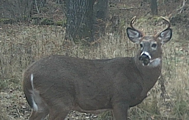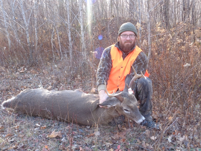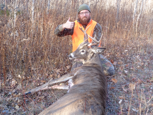 Le premier jour, je décide de chasser qu'en après-midi. Assis très tôt dans mon affut, j'ai la chance de voir un beau sujet, un 5 pointes estimé à 170-180 lb vide à 2h16 pm. Ma motivation à son paroxysme, l'idée de prendre ma carabine en main ne m'effleure pas l'esprit. Après l'avoir observé pendant une vingtaine de minutes, il entre à couvert. Je venais de glisser le plus gros buck que j'avais sur mes caméras de surveillance.