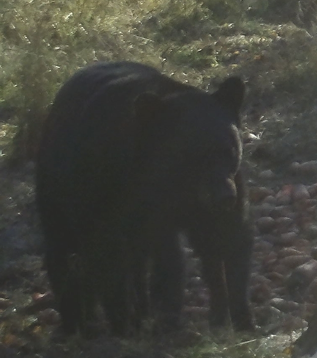 Après quelques bières avec mon super ami de toujours, un diner rapide, une séance à regarder nos photos respectives, je retourne m'asseoir dans mon affût. Le temps fil, en compagnie d'un veau et d'un porc-épic, je patiente. Un peu avant le crépuscule, une femelle et un veau progressent, puis un 8 pointes sorts derrières eux. Un 8 pointes de 2.5ans que j'estime à 130-135lbs vide. En joue, je le regarde mais celui-ci ne corresponds pas à mes objectifs à cette date alors je le glisse. Soudain, tous quittent rapidement les lieux vers la droite. Assurément, quelque chose progresse en provenance de la gauche... Quelques instants plus tard, il se pointe le bout du nez, un ours ! Décidément, la nature me gâte aujourd'hui. Il est beau à observer, il demeure avec moi une quinzaine de minutes avant de s'en retourner d'où il venait.